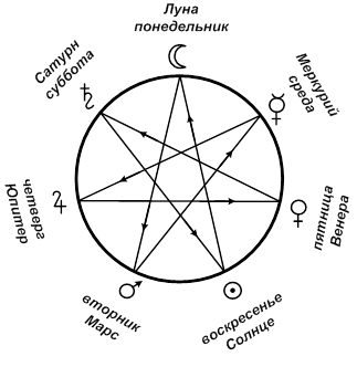 Разделив сутки на 24 часа, древневавилонские астрологи составили представление, будто каждый час суток находится под покровительством определенной планеты, которая как бы «управляет» им. Счет часов был начат с субботы: первым ее часом «управлял» Сатурн, вторым – Юпитер, третьим – Марс, четвертым – Солнце, пятым – Венера, шестым – Меркурий и седьмым – Луна. После этого цикл снова повторялся, так что 8-м, -15-м и 22-м часами «управлял» Сатурн, 9-м, 16-м и 23-м – Юпитер и т. д. В итоге получилось, что первым часом следующего дня, воскресенья, «управляло» Солнце, первым часом третьего дня–Луна, четвертого – Марс, пятого – Меркурий, шестого – Юпитер и седьмого – Венера. Соответственно этому и получили свои названия дни недели. Последовательную смену этих названий астрологи изображали вписанной в окружность семиконечной звездой, в вершинах которой обычно ставились названия дней недели, планет и их условные обозначения (рисунок 00).