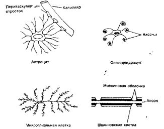Пространство между нейронами заполнено клетками, которые называются нейроглией (термин глия- обозначает клей, клетки “склеивают” компоненты ЦНС в единое целое). В отличие от нейронов клетки нейроглии делятся в течение всей жизни человека. Нейроглиальных клеток очень много; в некоторых отделах нервной системы их в 10 раз больше, чем нервных клеток. Выделяют клетки макроглии и клетки микроглии (рис.4).